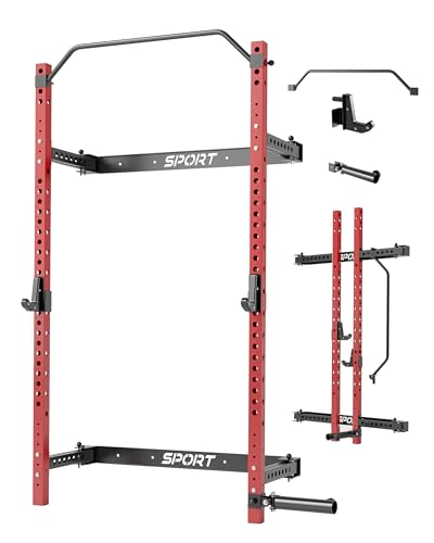 Folding Squat Rack for Home Gym, 1000 LB Capacity Wall Mounted Power Rack with Pull Up Bar, J Hooks and More Attachments, 2.36″ x 2.36″ Space Saving Multifunction Power Cage, Black/Red